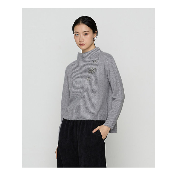 ■ショートカーデ同様、ビーズ&スパンコールで描いた雪の結晶が美しい、アクセサリー要らずの華やかなボトルネックセーターです。