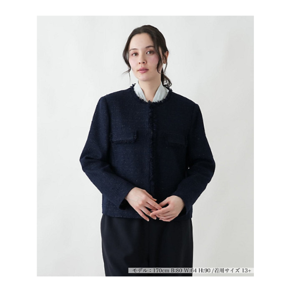 ■上品な丸首のノーカラーデザインが、女性らしく柔らかな雰囲気を演出するジャケット。