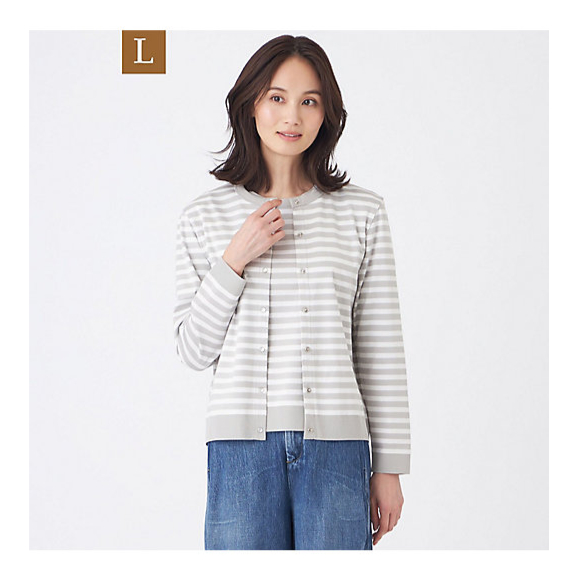 【L】【ウォッシャブル】セーターマシンカーディガンこちらの商品はラージサイズです。フロントにパールボタンをあしらったきれいめなクルーのカーディガンです。ニットとカットソーのいいとこどりしたアイテムで、比較的長い期間着用していただけます。手洗い可能でイージーケアです。ベーシックな配色ボーダーなので末永くご着用いただけます。スペインのJUMBERCAの18Gの成型機を使用した特殊な生地になります。ニットとしては目が細かく、カットソーとしては編み出しがつくなどの表現ができるちょうど中間のニュアンスを持つ素材です。60/2の超長綿をシルケット加工し、カジュアルだけれどもエレガントな表情を持つ生地に仕上がっています。アームホールには抗菌・消臭テープを附属しています。ラージサイズならではの悩みに応えるパターンメイキングで、すっきりと着ていただけます。■44サイズ→13号、46サイズ→15号が目安です。【着用推奨シーズン】オールシーズン