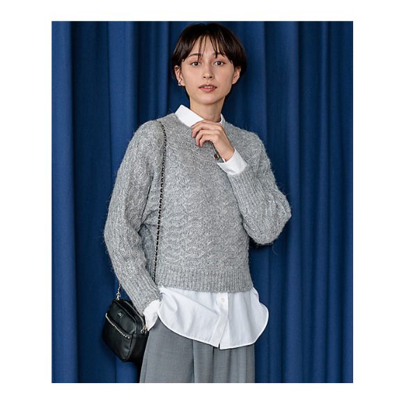 スパンコールが目を引くドルマンスリーブプルオーバー。素材をケーブル編みで贅沢に仕上げました。裾のリブは締め付けすぎず、腰で軽く止まるようになっているのがうれしいポイント。襟ぐりは太めのリブが付いたボートネックで、シャツや薄手のニットとのレイヤードもおすすめです。カラーは、明るい印象のホワイト(#001)、ニュアンス感をプラスするライトグレー(#003)、落ち着きのあるグレー(#004)の3色展開です。