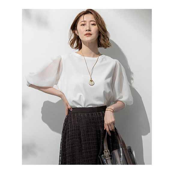 袖に透け感のあるさり気ないチェック柄の別布をドッキングしたプルオーバーニット。襟開きを横に広めにとり女性らしい印象に仕上げ、肩は華奢に見えるようシルエットやサイジングを工夫しました。袖ぐりと袖にはゆとりを持たせてボリュームをつけているのでストレスフリーに心地よく着用できます。ボディーサイズに少しゆとりを持たせることで、パンツやスカートなどあらゆるボトムと好相性で、汎用性の高いアイテムです。カラーは爽やかなホワイト(#001)、シックな印象のブラック(#005)、エレガントなネイビー(#075)の3色展開です。