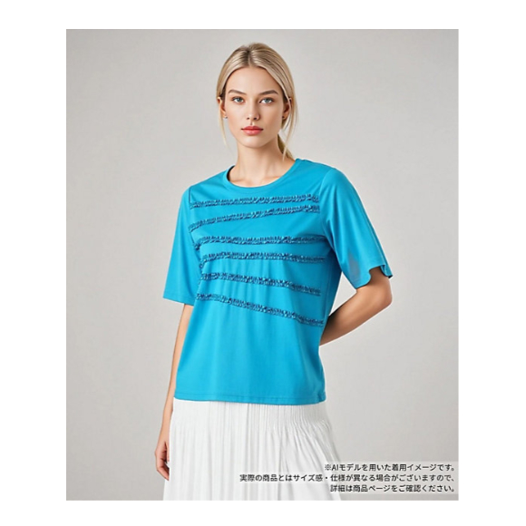 リボンボーダーで魅せる、大人の甘さが引き立つカットソー。胸元に施された繊細なリボンフリルをボーダー状に施したデザインが目を惹く一枚。シンプルなカットソーにほんのり甘いエッセンスをプラスし、さりげない個性を表現しました。コットンをベースにナイロンをブレンドした生地はさらりとした軽やかな肌触りで、これからの季節に快適な着心地を叶えます。生地には程よい伸縮性があり、動きやすさも抜群です。