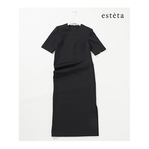アシンメトリーなドレープデザインが印象的な半端袖ブラックドレス。着用すると右脇でドレープが寄る設計になっています。スポーティな素材にドレッシーなドレープがミックスされた大人の遊び心を感じるデザイン。ジャージー素材ならではの着心地の良さと、肉感のある素材感で、身体のラインを拾いづらくシワにもなりにくいので、デイリーにも出張や旅行にも最適な1着です。