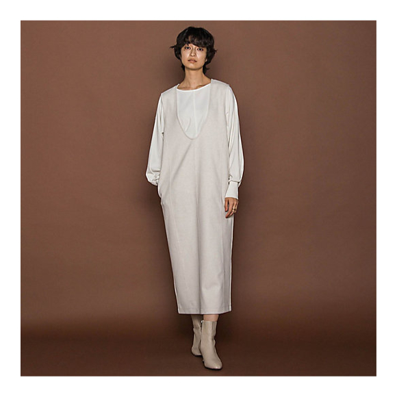 大胆なUネックカットが抜け感を、縦ラインを強調したシルエットが細見えを叶える、ジャンパードレス。