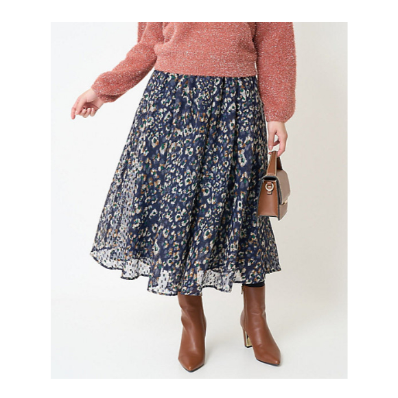 シフォンのドットジャガード生地にフラワーモチーフのようにも、レオパードのようにも見える抽象的なプリントのスカート。落ち感がある素材は広がりすぎないので甘くなりすぎず大人っぽく着こなせます。ウエストゴムでストレスフリーな着心地も嬉しい。