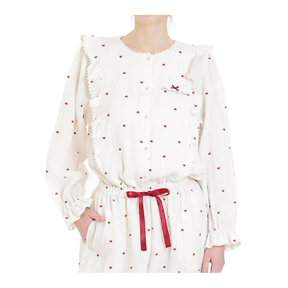 柄は小さなハートプリント。可愛すぎない大人のハート柄です。優しいイメージのピンクハートと、明るいイメージの赤ハートの2カラー展開です。可愛いだけではなく、ノーメイクでもお顔周りを華やかに引き立ててくれるフリルデザインの前開きパジャマ。肩より内側の縦のラインにフリルを付ける事で、肩幅を華奢に見せてくれる嬉しいデザインです。袖口はゴム仕様。裾のゴムは緩やかにする事でお腹周りをカバーしつつ、丸みのフォルムで可愛らしい柔らかな印象に。パンツの裾にはゴムを入れふっくらとした可愛らしさだけでなく、低身長さんにも安心な着用感になっています。光沢感が綺麗なサテンリボンで可愛さもプラスし、トップスをインできる仕様に。