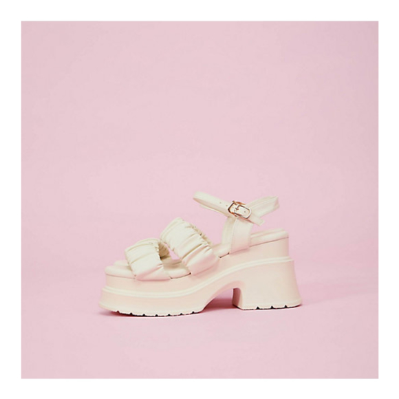 アッパー部分はシャーリングの施された幅のあるダブルストラップデザインで甘さをプラスしています。