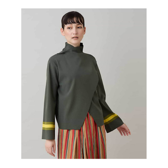 しなやかな質感で着心地の良いカジュアルに合わせられる一枚。重なり合ったディテールはフロントだけでなく、やや高さのある衿元にも立体感を付けてすっきりと演出。ビビットな配色アクセントを加えた幅のある袖先がスタイリングに動きと華やかさをプラスします。
