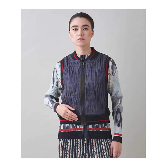 ワッシャープリーツ加工を施した立体的なデニム風生地がオリジナリティあるデザイン。後ろはスポンディッシュなダンボール素材、アウトラインに配色ラインのリブを合わせたスポーティーさも魅力。ダブルジップフロントで着脱しやすく、プラスワンアイテムとして活躍してくれるおすすめの一着です。
