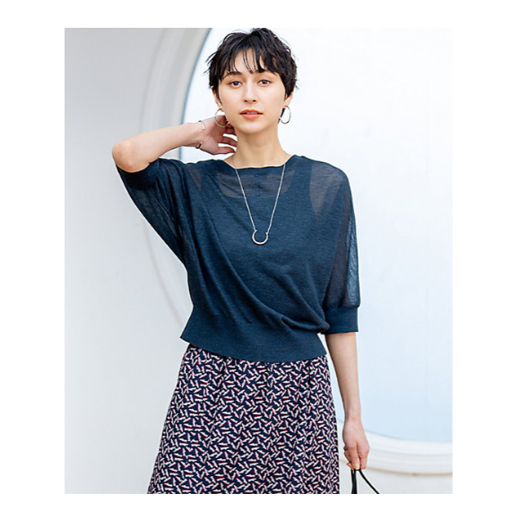 アームの締め付けのない、ドルマンスリーブの5分袖カーディガン。二の腕をカバーしつつ、上品な透け感のある素材で涼し気な印象です。襟はクルーネックで前後着用できるようにしています。裾のリブが腰で止まるような作りなので、コンパクトなプルオーバー風に着るのがおすすめです。カラーは、抜け感のあるアイボリー(#003)、ベーシックなブラック(#005)、ナチュラルな印象のブラウン(#030)、こなれ感のあるダークグリーン(#065)の4色展開です。