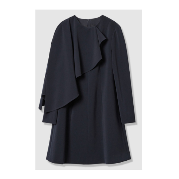 程よい膨らみを持つマットなダブルクロスで仕立てた、片側だけにケープをあしらった印象的なワンピース。衿ぐりで固定されているためずれにくく、ケープのスリットから腕を動かしやすい実用的なデザインに。身頃はウエストをほどよくシェイプし、裾に向かって広がるレディなフレアシルエット。軽やかなひざ丈で、特別な日にも日常にも華やかさを添える一着。