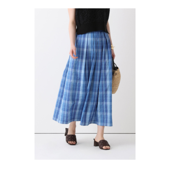 フランスリヨンにある200年以上の歴史をもつテキスタイルメーカーデボー社のオンブレーチェック素材を使用したタックプリーツスカート。裾に向かって拡がる優しいボリューム感が、夏の装いに華やかさをプラス。動くたびに揺れる表情豊かなシルエットが魅力で、シンプルなトップスと合わせるだけでスタイルが完成する主役級アイテム。