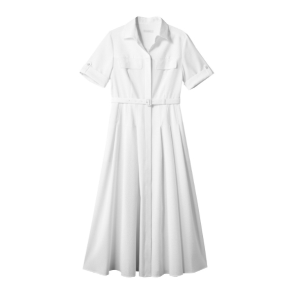 女性らしいフォルムに胸ポケットや袖のターンバックがスパイスを添えるワンピース。サッカー素材のさらっとした清涼感のある肌あたりが夏場でも快適な着心地をお約束。ベルトでキュッと絞ったメリハリのある1枚は、夏はメインで、春先はデニムジャケットやワークテイストなアウターを羽織ってもおしゃれ。トルソー着用はネイビー、2サイズ。