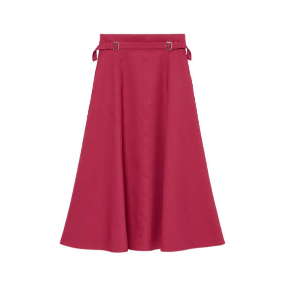 裾に向かって分量をだした8枚接ぎのフレアシルエットスカート。適度なハリ感とコシ、ふくらみ感のあるツイル素材を使用。肉感と光沢、風合いがシーズンレスで着やすい素材。前ウエストの、サイドにバックルをあしらったベルトディテールがポイントになった、ポケット付きのデザイン。今季気になるベリーカラーをアクセントに、ベーシックカラーと4色の展開。