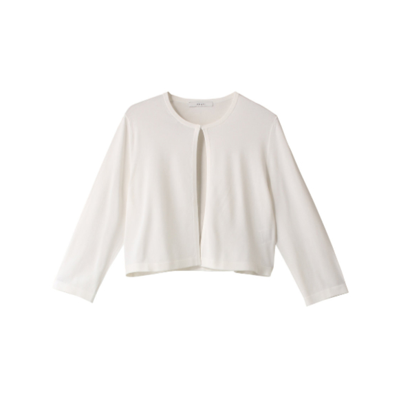 程よい光沢感のあるドライタッチな風合いで上品に仕上げたボレロ風ショート丈カーディガン。シンプルなデザインで合わせるものを選ばないのがポイント。軽い羽織りとしてデイリーにはもちろん、キレイめなワンピースに重ねて上品に、と幅広いコーディネートで大活躍してくれそう。トルソー着用は ブラック 38サイズ