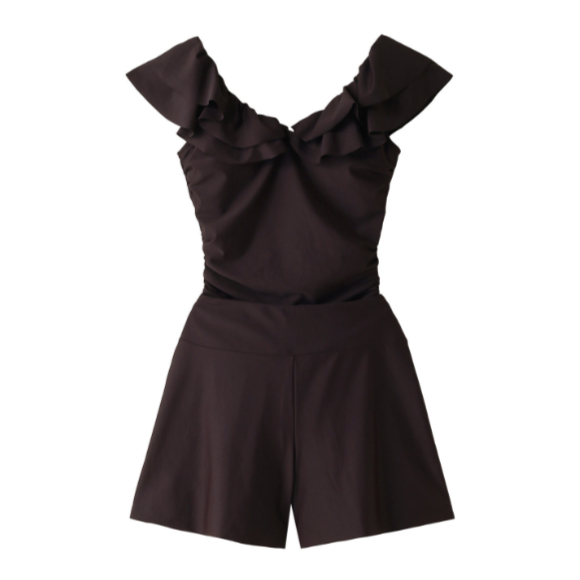 「ANAYI」×「Reir」から女性らしさ満点のワンピース水着が登場。フェミニンなディテールとシックなカラーリングで、大人の華やかさを表現したセット水着。立体感がでる二枚仕立てのフリルが華やかさを出してくれます。目線がフリルにいくことで、ボディラインがすっきりと見え、スタイル良く見える効果も。後ろ姿をキレイに見せる大胆に開けたカッティングもこだわりのデザイン。ポイントの紐リボンで安心できる着用感。 セットのショートパンツはスカート見えするシルエット。おなか周りがスッキリ見える切り替え位置も◎。程よいハリ感のある水着素材はUPF50+の機能。スイムウェアと同素材のロゴ入り巾着付。プールや海にはもちろん、リゾートのお出かけにも愛用して。トルソー着用はブラウン 09(M)サイズ。