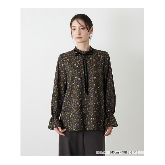 クラシカルな小花柄に、温かみのあるリボンタイが映えるブラウス。リボンタイは取り外し可能で、シンプルなスタンドカラーブラウスとしても着回せる2WAY仕様。袖口のシャーリングが手元にフェミニンなニュアンスをプラス。ほんのりとした透け感も着こなしに軽やかさを与えるエッセンスに。パンツ、スカートを選ばずに合わせやすく、秋冬コーデの主役になれるアイテムです。バックファスナーにより開閉が可能。