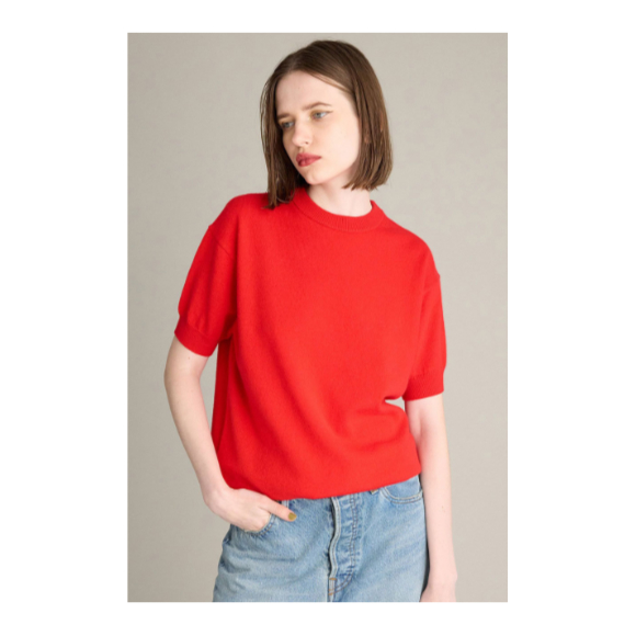 糸生かしのシンプルなハーフスリーブプルオーバー。近年は秋でも暑かったりして気温が定まらない気候が多いので ウールと比べ肌が弱い人でもチクチクしないカシミヤのハーフスリーブは活躍すること間違いなし。