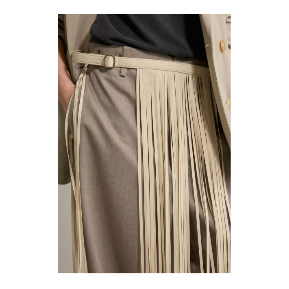 長いフリンジにバックルつきのベルトをつけたデザインのベルトは、サイズ調整が可能な為、スタイルに合わせてつける位置を調整可能。