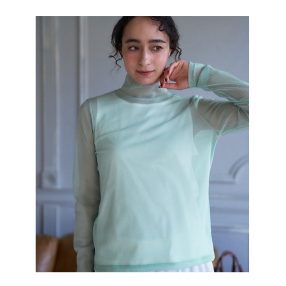 繊細なドット刺繍が施された、フェミニンな表情のシアーカットソー。チュール素材に浮かぶ立体的なドットが、コーディネートにさりげない甘さと奥行きをプラスします。ポイントは顔周りに柔らかなアクセントを添えるハイネックのメロー始末。甘くなりすぎないこだわりのディテールです。スウェットやニットのインナーとして首元をちらりとのぞかせるレイヤードスタイルもおすすめ。初秋の着こなしを軽やかに彩る、着回し力抜群のアイテムです。