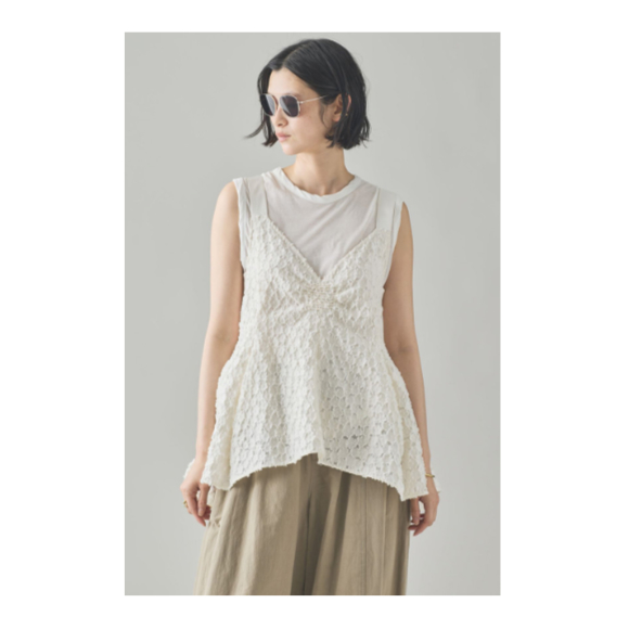 胸元の細かいタックがポイントのキャミブラウス。立体感のあるデザインで、同素材のジャカードバルーンパンツとセットアップで着用可能。単品で着用する場合はデニムなどのカジュアルなボトムとのコーディネートもおすすめ。