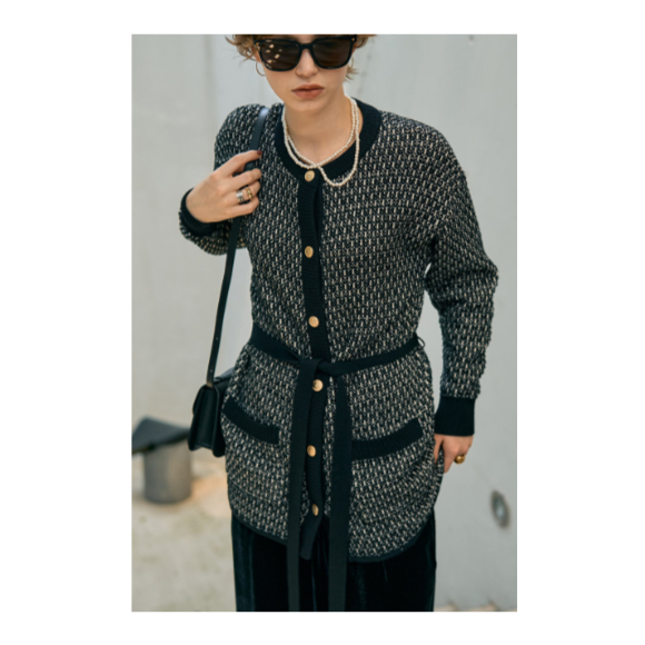 大きめのゴールドボタンがクラシカルで ヴィンテージ感を演出するロングカーディガン。取り外し可能なニットベルト付きで、前を閉じてローブジャケット風にも、さらりと羽織ってカーディガンとしても楽しめるデザイン。
