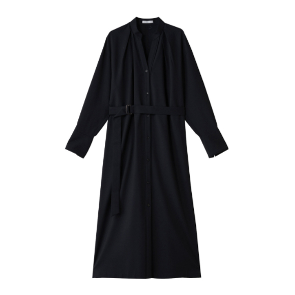上質なウール100%素材を使用し、適度なハリとしなやかさ、ほのかな光沢が魅力のワンピース。フロントはすっきりと、バックはふんわりとした立体感のあるシルエットで、ベルトの有無で雰囲気の変化を楽しめる。バンドカラーから続くVネックがシャープな印象をプラス。前開き仕様のため、軽い羽織りとしても活躍し、1枚で着映えする存在感が魅力。トルソー着用はブラウン 36サイズ。