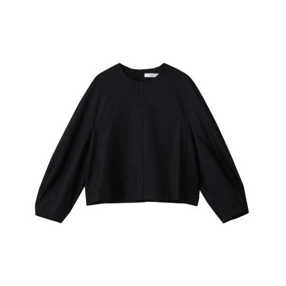 短めの着丈が今年らしく、クリーンな佇まいが好印象をもたらすプルオーバーブラウス。薄手のポプリンメルトンを用いて、極薄フランネルのような独特な風合いでウォーム感を出し、きれいな表情に仕上げた1着。中心のハギ、袖口のダーツ、背中の隠しファスナーも、デザインのアクセントに。幅広いテイストでコーディネートを楽しんで。トルソー着用はブラック、38サイズ。