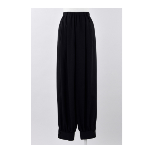 スーツ地のバルーンシルエットのパンツは、脇側はボリュームは出さず、股下側にてボリュームを出すことで野暮ったい印象にならず、すっきりとした印象で大人の女性もカッコよく履いて頂けるデザイン。