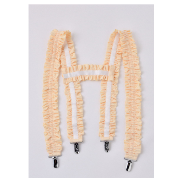 タフタ生地を使用し、ギャザーを寄せてデコラティブなディティールのサスペンダーは、薄着になってくる季節には嬉しいスタイリングのポイントになる小物アイテム。