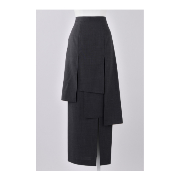 四角いパネルのようなパーツをいくつも重ねたようなデザインが特徴的なスカート。