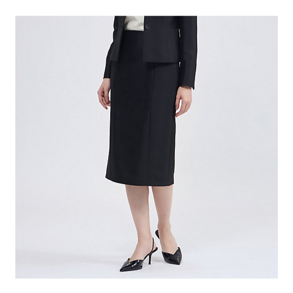 【デザイン】シルエットの美しさにこだわったひざ下丈のタイトスカートです。タテの切り替えが美しいIラインを引き立たせます。同素材のジャケット(品番:M5E07729)とセットアップで綺麗に着用いただけるバランスに仕上げました。透け感:なし伸縮性:なし生地の厚さ:普通おすすめ着用期間:春、秋、冬