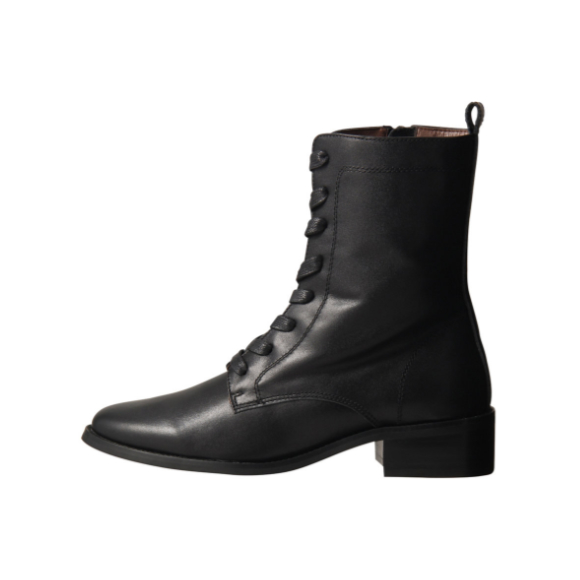 一見シンプルな顔立ちながら、レースアップディテールがフェミニンさを添えるショートブーツ。すっきりとした細身のシルエットが大人の女性らしさを後押し。安定感のある太ヒールのおかげで長時間の歩行も疲れにくく、デイリーのお出かけやご旅行時にも最適。きれいめやモードな装いにも溶け込みそう。