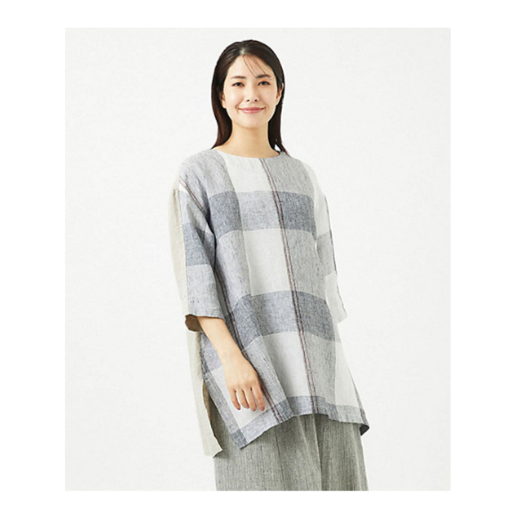 大きいチェック柄を前身頃と袖に、後身頃は東炊きリネンの無地を使い合わせた異素材使いのプルオーバーブラウスです。首元は丸衿ですが、後開きにして着脱しやすい仕様にしています。身頃は分量をとったゆったりなAラインシルエット。サイドにはスリットを入れてすっきりとした印象にしています。