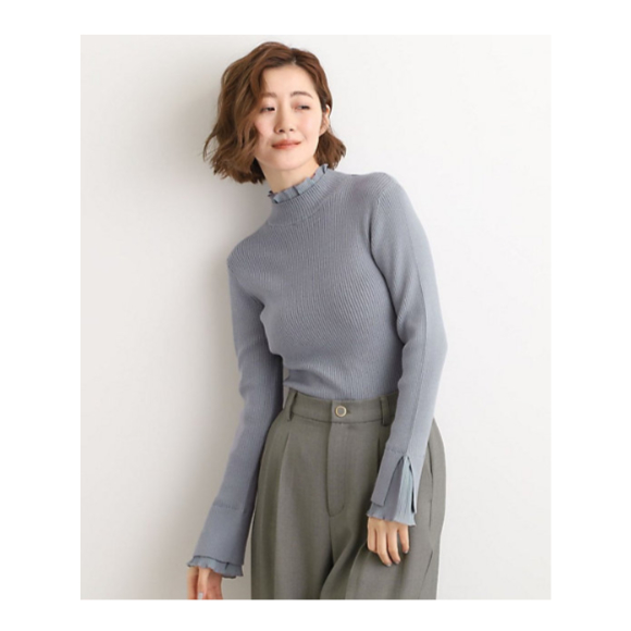 リブ編みのすっきり感と、柔らかく揺れるプリーツのコントラストが大人可愛い印象を引き立てます。