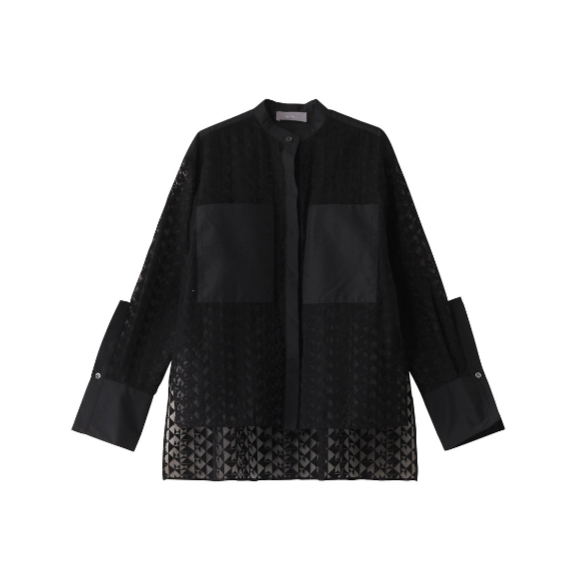 ジオメトリックなシアーレースがモダンな雰囲気を振りまくブラウス。ポケットや袖口、前立てはクリーンな無地素材で切り替え、ミニマルなかっこよさを表現。色合いはシックにまとめ、ドレッシーな着こなしからデイリーの主役まで活躍する予感。今季はパンツやジャケット合わせでとことんマニッシュにまとめるのがおすすめ。