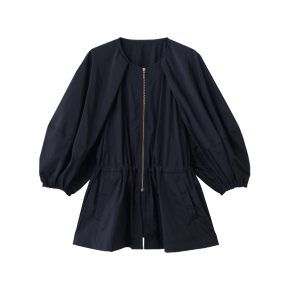 光沢感のある風合いとボレロのようなボリューミーなバルーンスリーブ、ペプラムシルエットが華やかなアクセントをプラス。ドロスト仕様になったウエストでシルエットを調節できるのも◎。羽織りとしてはもちろん、ブラウスとして着こなすのもおすすめ。トルソー着用はネイビー 36サイズ