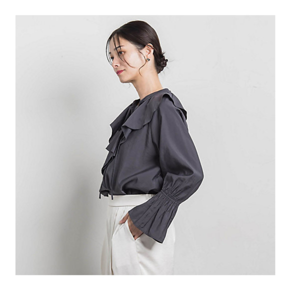 ■大きめのラッフルが顔まわりを華やかに見せるブラウス。