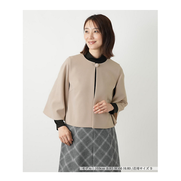 ■カーディガン感覚でさっと羽織れる、ケープ風デザインのノーカラージャケット。