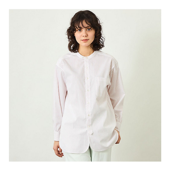 【GREY LABEL】バンドカラーパターンドシャツミリタリードレスシャツをイメージしたオーバーシルエットのバンドカラーシャツ。長めのレングスと深くラウンドしたフロント&サイドのカッティングがクラシカルなデザインアクセント。衿の持ち出しと角落としの胸ポケットで少しミリタリーテイストを加えています。衿ボタンを2個留めると首元のアクセントに。