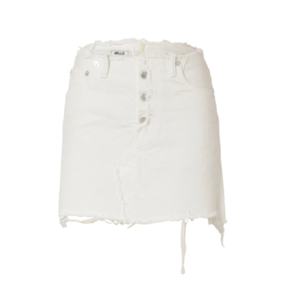 ディレクターの中山氏が20年近く愛用するリメイクスカートをリプロダクト化したホワイトデニムミニ。7番手の糸をタテヨコに使用した13OZのデニム地は適度なムラ感があり、裾はフレイドヘム仕様で抜け感をプラス。後中心にはパイピングを施し、細部まで丁寧に仕上げられているのも魅力。Tシャツからラグジュアリーアイテムまで、幅広いスタイルにマッチ。