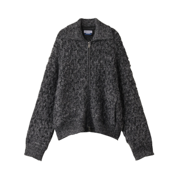 モヘア混素材をぜいたくに使用したケーブル編みブルゾン。立体的な編み地が温かみを演出し、リラックス感のあるシルエットで快適な着心地を実現。ユニセックスデザインで、幅広いスタイリングに対応。ジップアップ仕様で、軽い羽織りとしても活躍する万能な一枚。カジュアルからモードまで自在にアレンジ可能。トルソー着用はBLK(ブラック) 1サイズ。