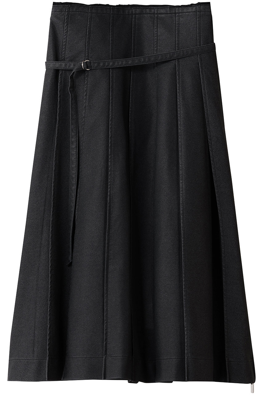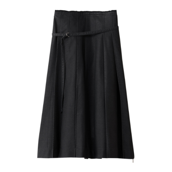 しっかりとしたハリ感のあるフェイクレザーのビンテージライクな風合いがこなれた大人のスタイリングに導くスカートをセレクト。片側サイドファスナーでヘルシーな肌見せを叶えて。たっぷりとした分量感のあるプリーツデザインにウエストベルト付きだからトップスインもサマになりそう。スウェットなどでカジュアルダウンしても、シャツやブラウスでオンシーンにもOK。トルソー着用はBLK(ブラック) 36サイズ。
