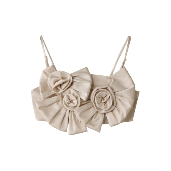 ・立体的に仕立てたローズとリボンのディテールが、胸元に華やかなアクセントを添え、スタイリングにモードなムードをプラス。 甘くなりすぎない絶妙なバランス感で、フェミニンな中にも芯の強さを感じさせる一枚。