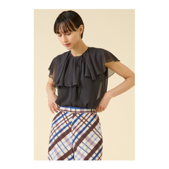 華やかで可憐さのあるフレア衿がポイントのノースリーブブラウス。衿は取り外しが可能で前後を入れ替えたり、ウエストなどに巻きつけるのもおすすめ。取り外してシンプルなノースリーブとして着用も可能。