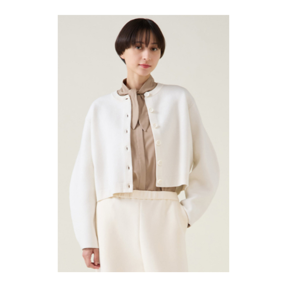 ダブルフェイスニットのカーディガンは、初冬にはアウターとして、真冬にはコートのインナーとしてプルオーバーのように着て、長い期間着用可能。丸みのある袖と、大きめのボタンがデザインポイント。