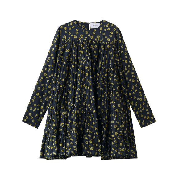 「マーレット」の定番ドレス”SOLIMAN”を、軽やかなコットンとレモン色のフラワープリントで春顔にブラッシュアップ。裾にかけてふわっと広がる優雅なティアードデザインが、纏うだけでお出かけ気分を上げてくれそう。ひざ上丈が女性らしく、1枚ではもちろん、レギンスなどとのレイヤードもおすすめ。トルソー着用はネイビー、XSサイズ。