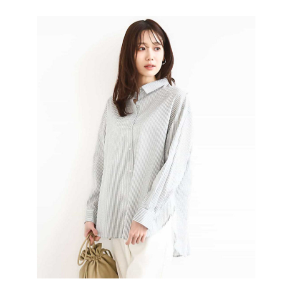 昨年大好評だったストライプシャツが、今年も登場。季節の変わり目から夏の紫外線対策まで、長いシーズン活躍してくれるのが人気の理由です。コットン100で肌触りがやわらかく、着心地も◎ 腕周りや身幅にゆとりがあるので、ストレス感なく着られました。ややシアーな素材感とストライプ柄が軽やかで、春にぴったりな印象。着丈は152cmの私で、ヒップが隠れるくらいの長さでした。羽織りとしてはもちろん、一枚で少しボタンを開けて後ろに抜いて着るのも、こなれ感が出ておすすめです。 —————-