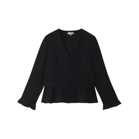纏うだけで大人レディなスタイリングに仕上げてくれるジャケット。トリアセテートの光沢と美しい風合いがきれいめな雰囲気をアップ。すっきり開いたVネックと袖口のフレア&裾が女性らしさを与えて。パンツからスカートまで色々な雰囲気で着まわしが効く1枚。トルソー着用はダークネイビー、36サイズ。