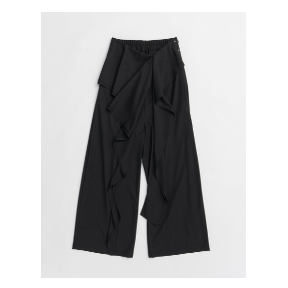 流れるようなドレープが美しい、フリルデザインのワイドパンツ。